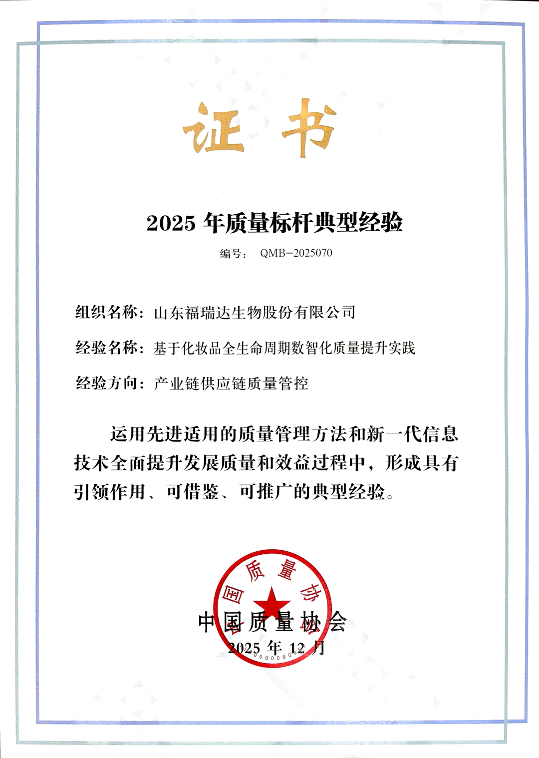 近日,中國質(zhì)量協(xié)會(huì)正式公布2025年全國質(zhì)量標(biāo)桿典型經(jīng)驗(yàn)征集結(jié)果,山東福瑞達(dá)生物股份有限公司憑借“基于化妝品全生命周期數(shù)智化質(zhì)量提升實(shí)踐”成功入選,這一榮譽(yù)不僅是對(duì)公司質(zhì)量管理創(chuàng)新實(shí)踐的高度肯定,更標(biāo)志著福瑞達(dá)生物股份在質(zhì)量管理、智能制造領(lǐng)域的探索獲得國家級(jí)權(quán)威認(rèn)可。
